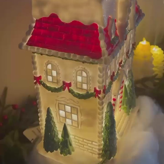 10" Gingerbread House with LED Lights – White, Red, and Green Christmas Decor