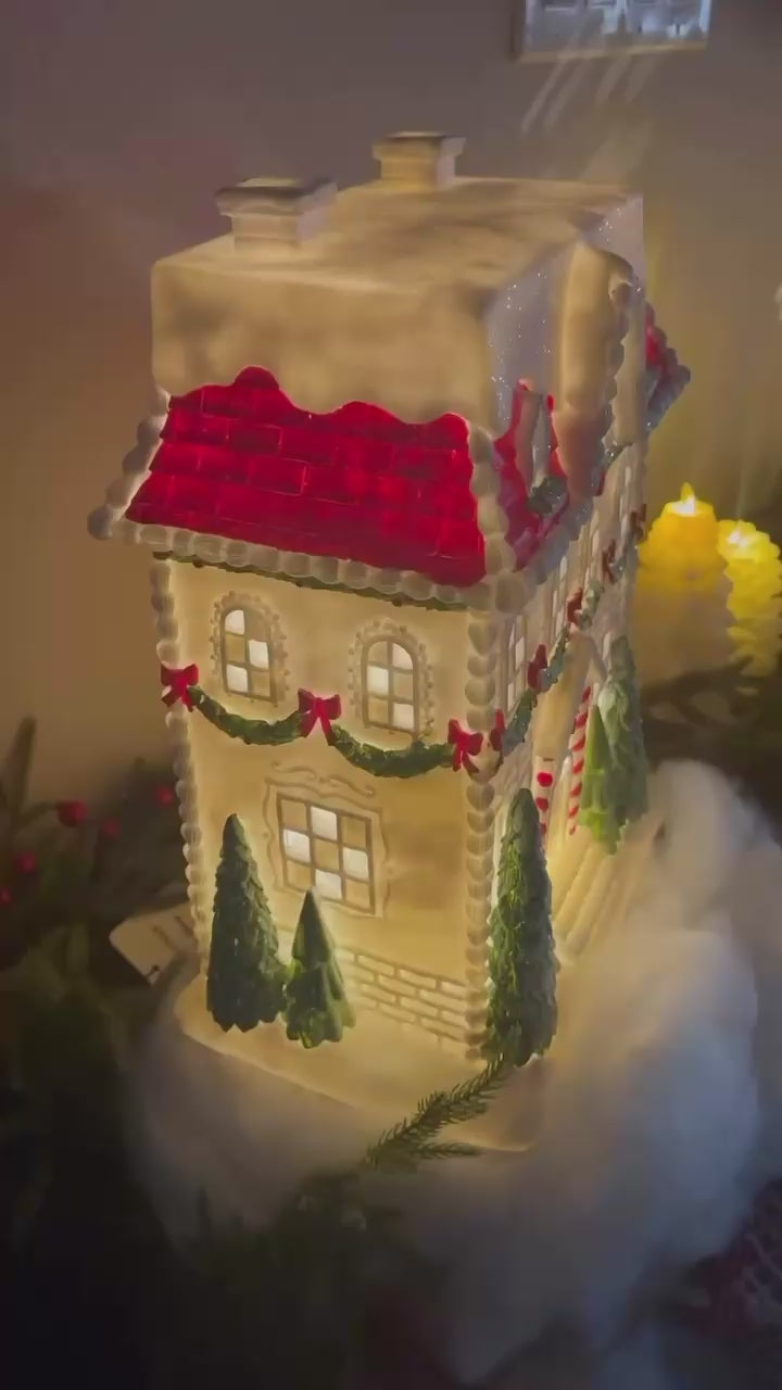 10" Gingerbread House, LED Light-Up Holiday Decor, White Red Green Gingerbread House, Festive Christmas Decoration, Christmas Village Gingerbread House, Whimsical Holiday Centerpiece, Holiday LED Gingerbread House, Chasryan LLC by RC Home.