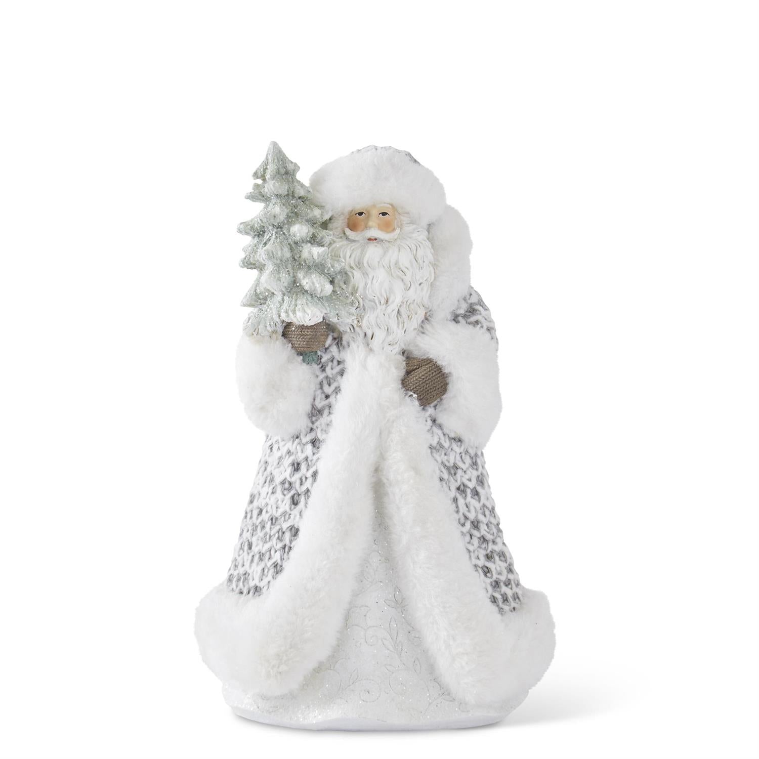 Add cozy elegance to your holiday décor with this 10" Santa figurine, featuring a gray knit coat with soft fur trim and a sparkling glittered Christmas tree.