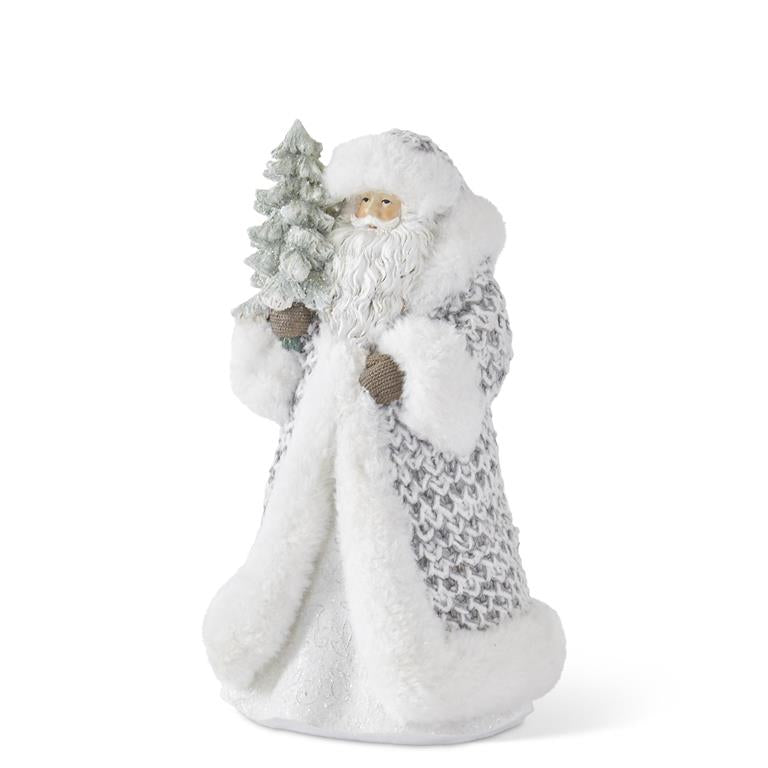 10" Gray Knit Coat Santa with Glittered Tree – Fur Trimmed Resin Christmas Figurine