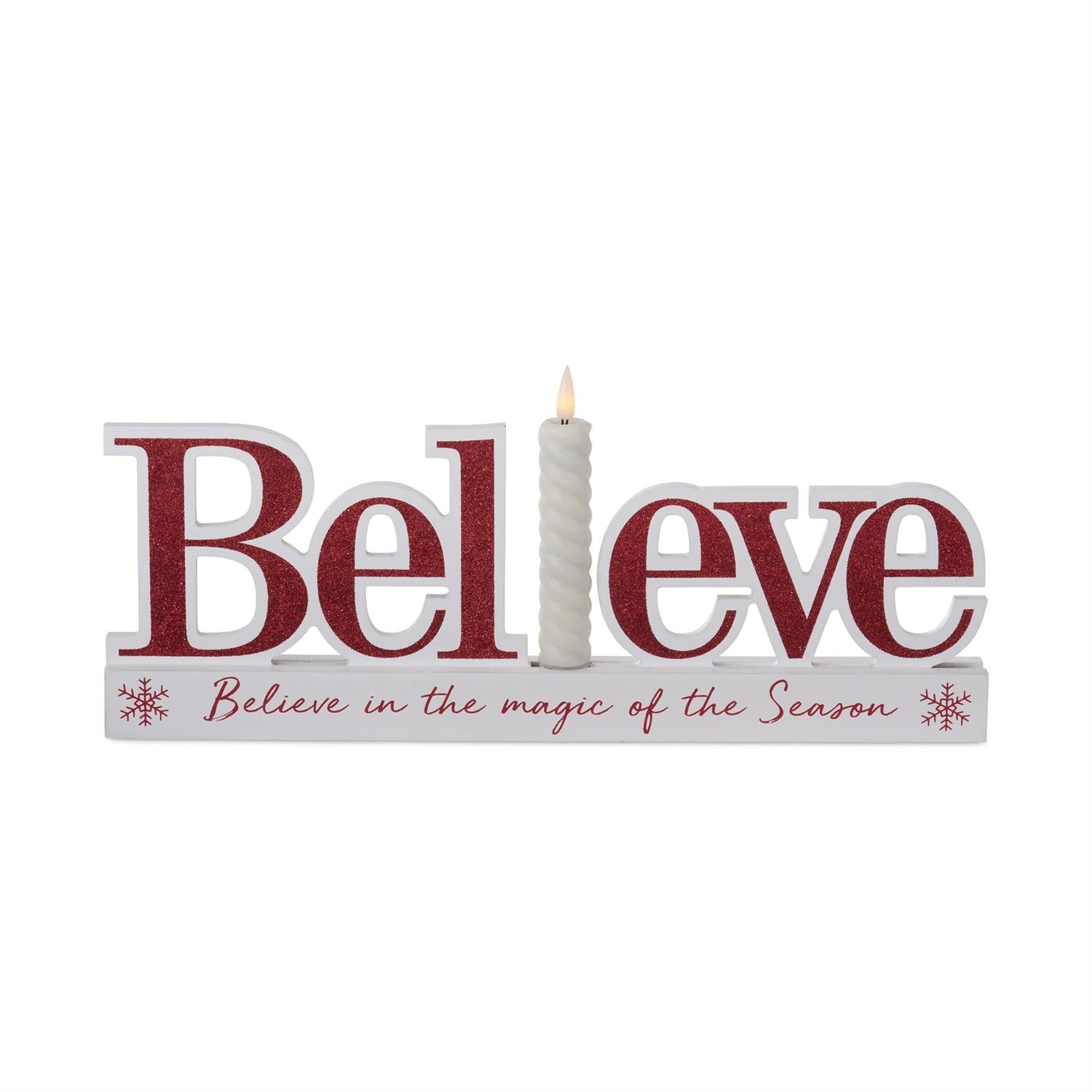 15" Red Glitter “Believe” Table Sign with Flameless Candle – Christmas Holiday Decor