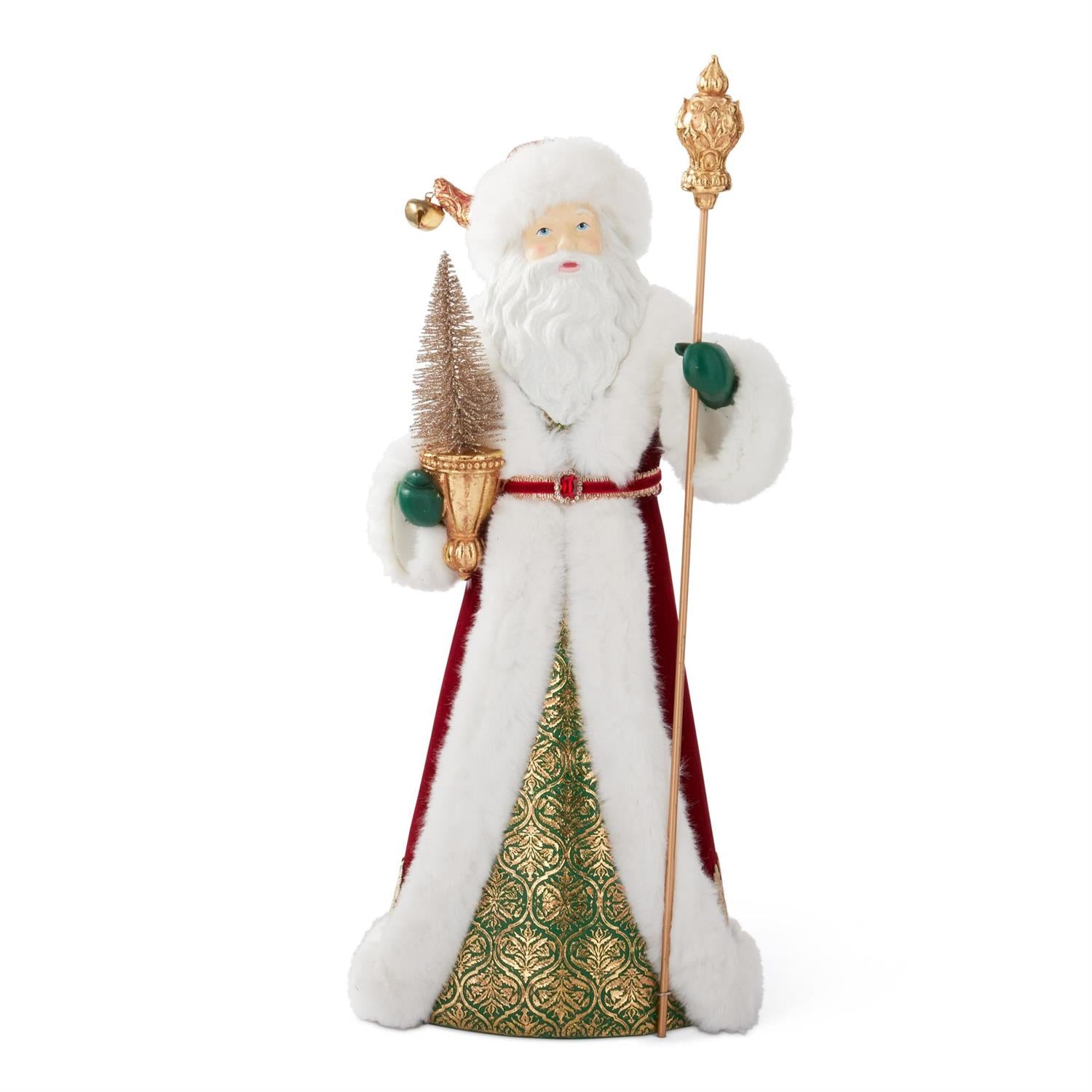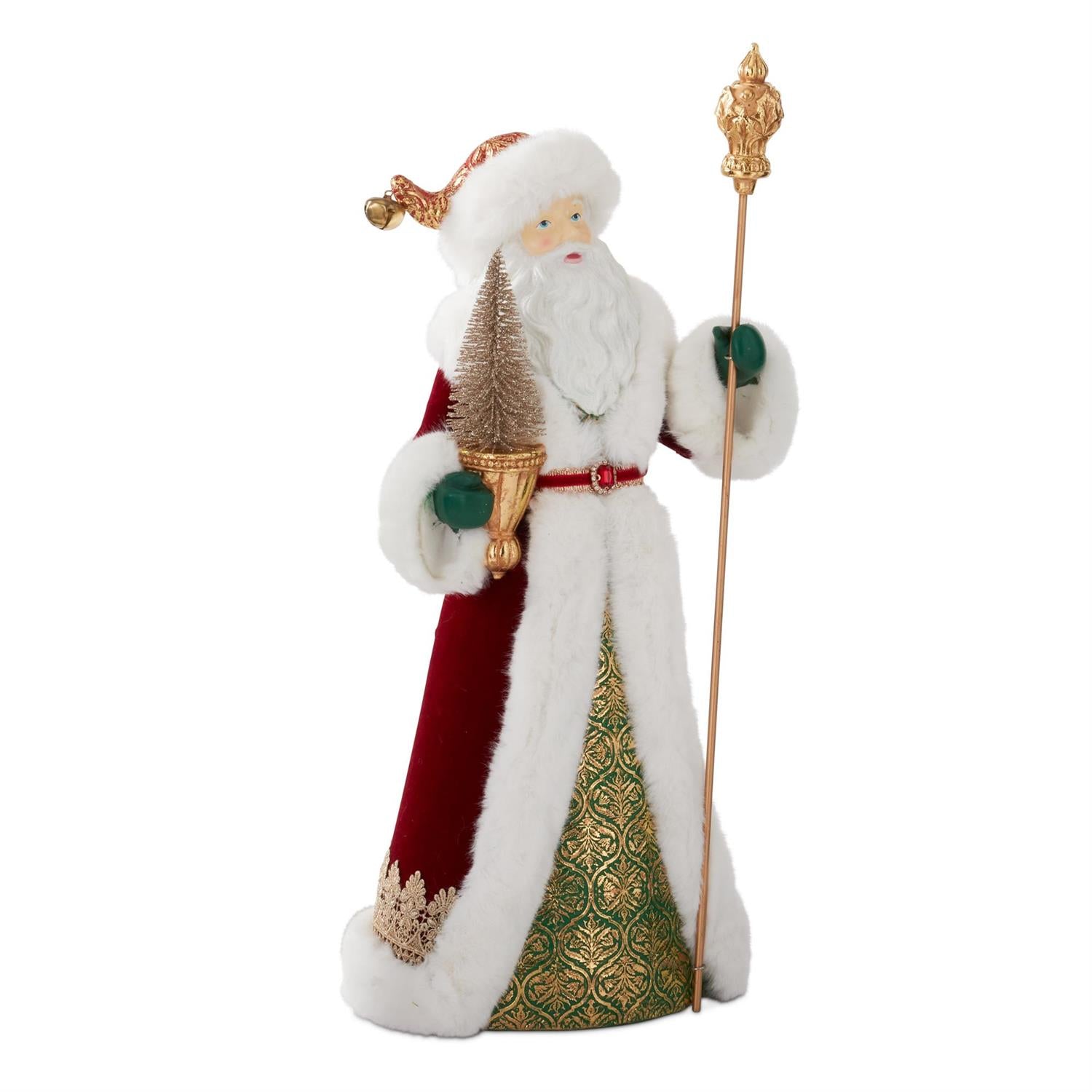 Elevate your holiday décor with this 21" Santa in rich burgundy and green robes, holding a sparkling gold tree and ornate staff for a timeless festive touch.