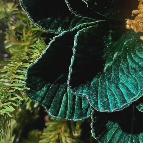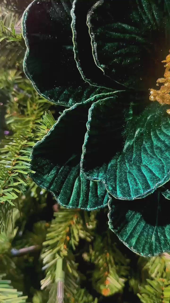 This stunning artificial floral pick features soft velvet petals in a sophisticated green tone, accented with subtle shimmer for added holiday elegance.