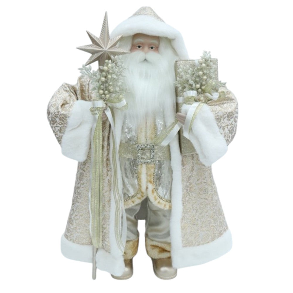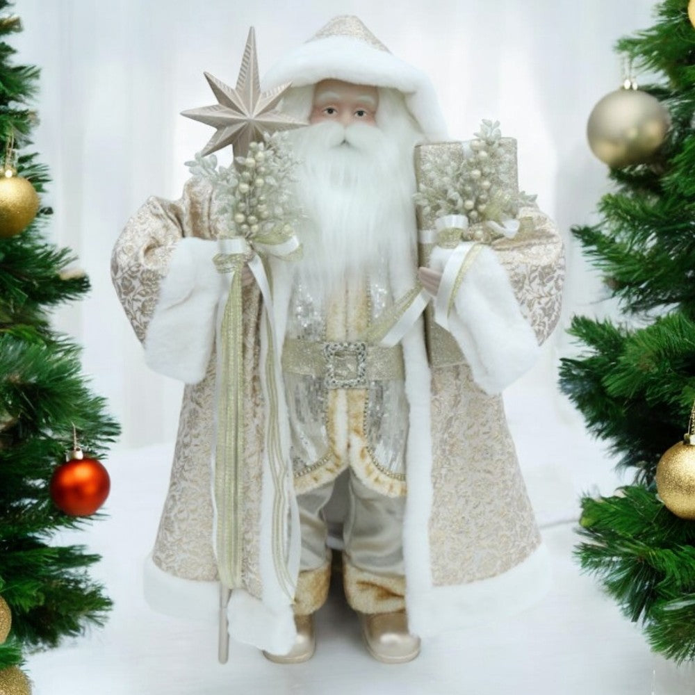 Bring timeless elegance to your holiday decor with this stunning 40” Santa Claus figure in luxurious ivory and gold. Dressed in a beautifully detailed robe adorned with gold accents and holding a sparkling star-topped staff and festive present, this Santa figurine is the perfect centerpiece for any Christmas display. The soft, flowing beard and intricately designed coat add a touch of classic charm, while the neutral tones seamlessly blend with any decor theme. Ideal for placing by the tree, fireplace, or entryway, this elegant Santa figure will add a sophisticated, festive flair to your home this holiday season.