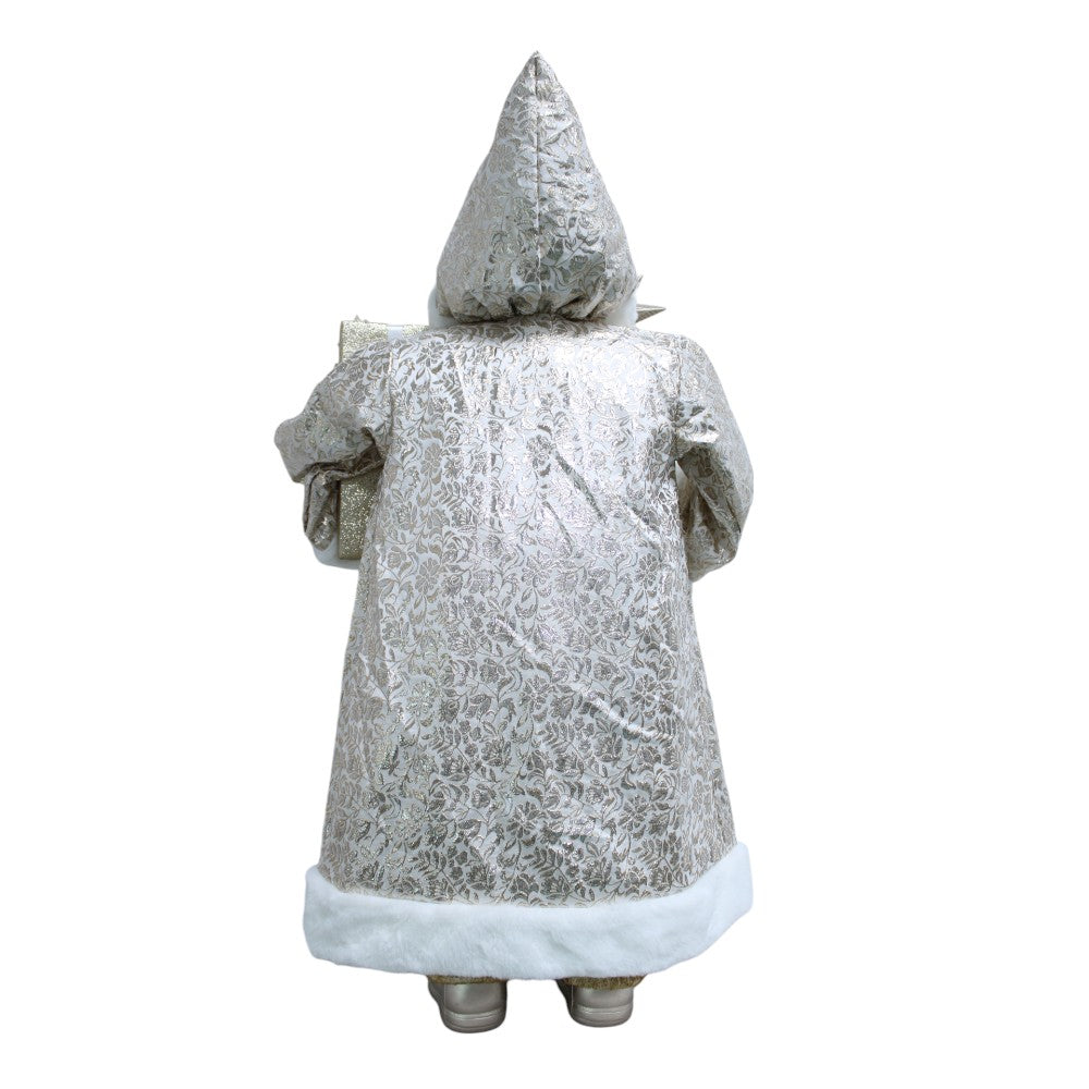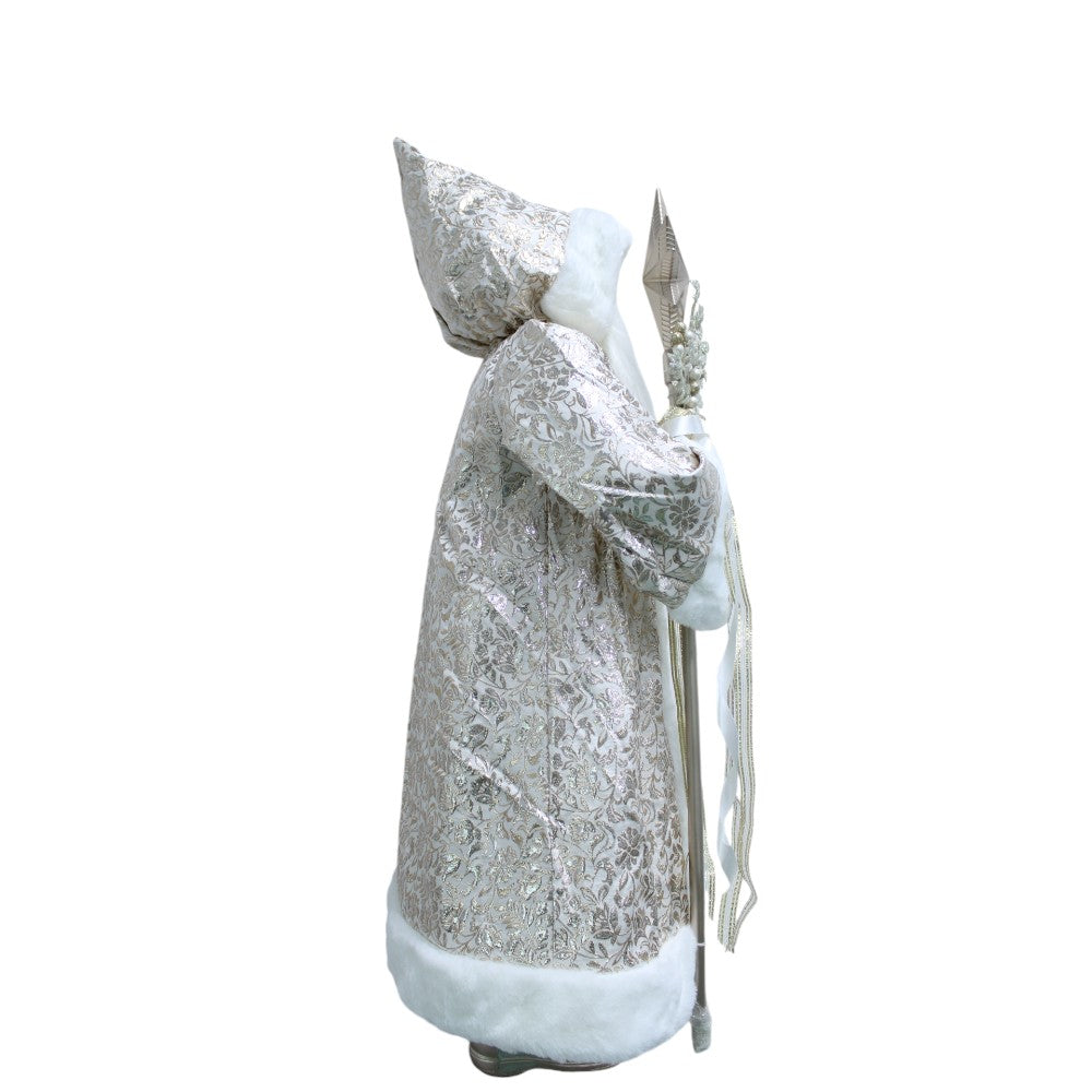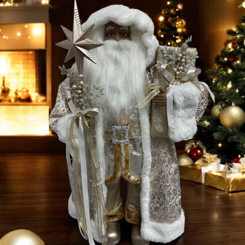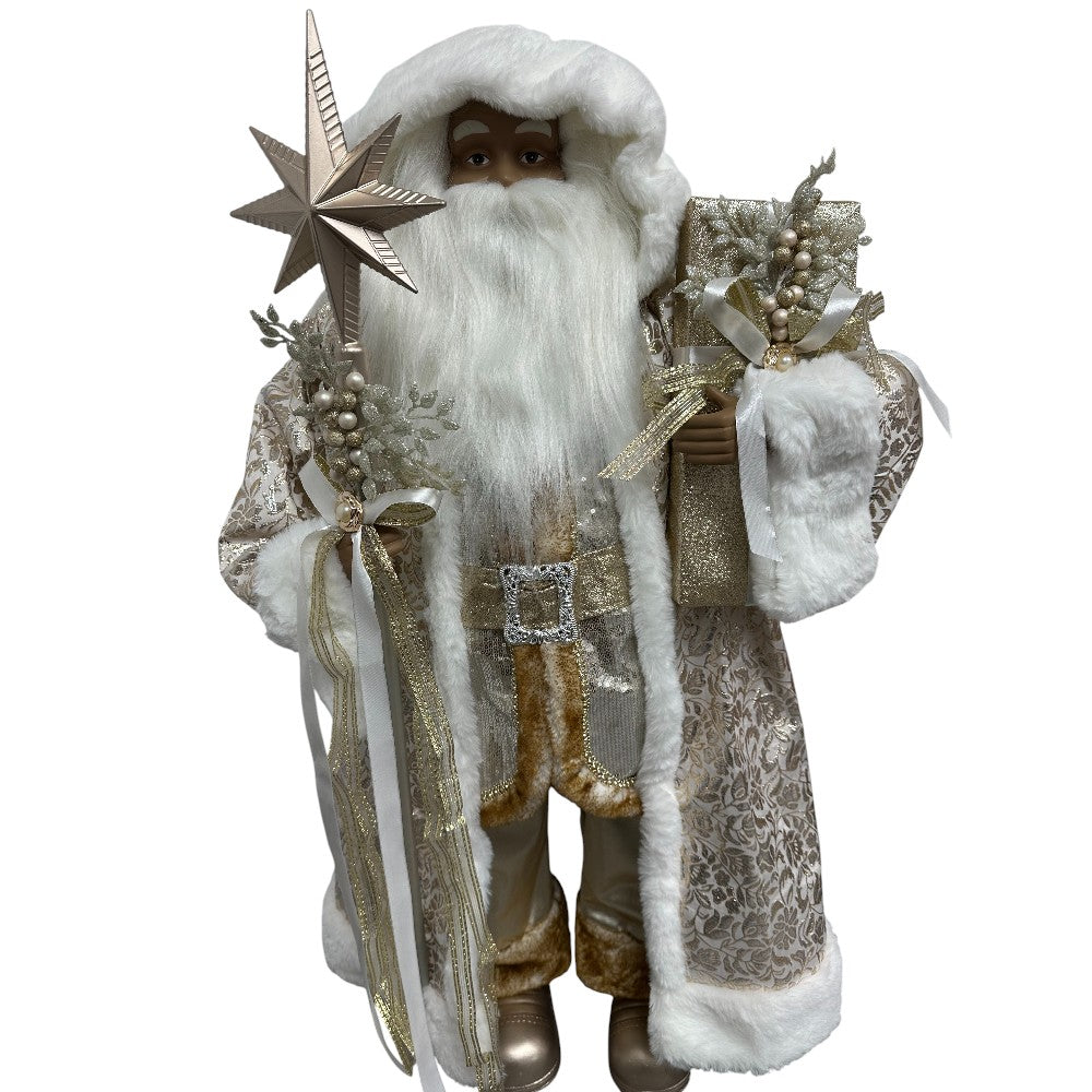 Enhance your holiday ambiance with this elegant 40” African American Santa Claus figure, crafted in refined ivory and gold. Clad in an intricately embellished robe featuring gold accents, Santa holds a radiant star-topped staff alongside a festive gift, making it an exquisite focal point for any Christmas arrangement. The gentle, flowing beard and meticulously designed coat embody timeless sophistication, while the subtle color scheme harmonizes effortlessly with diverse decor styles. Perfectly suited for placement by the tree, mantel, or entryway, this distinguished Santa figure brings a graceful and festive presence to your seasonal decor.