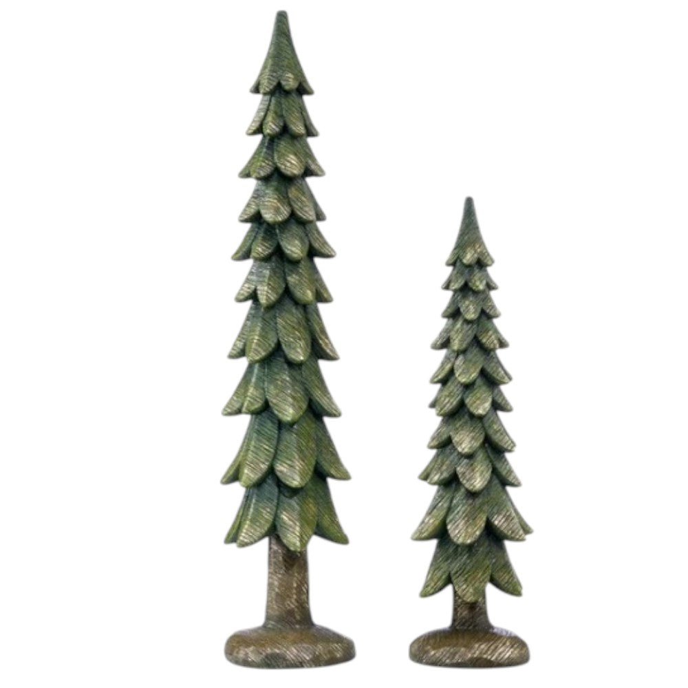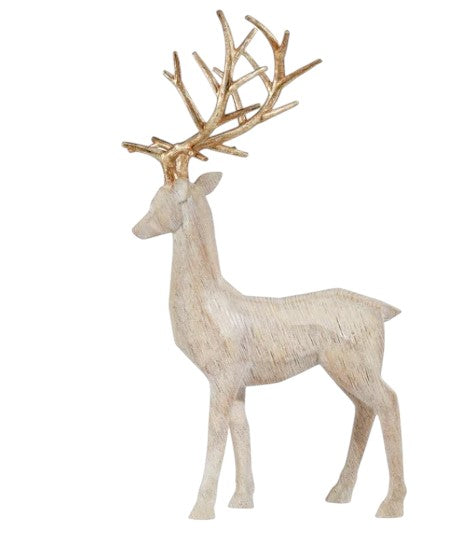 This elegant set is thoughtfully crafted to bring holiday charm to your home. It features three deer adorned with gold-painted antlers and two vibrant green trees, making it an ideal addition to your mantle, table, or any space in need of festive style and cheer. The set includes one standing deer, one sitting deer, and one baby deer, alongside two trees of varying sizes. Designed for indoor display, these pieces offer detailed craftsmanship and perfect proportions.Β